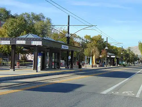 900 South is a light rail station in Downtown Salt Lake City, Utah, in the United States, served by all three lines of Utah Transit Authority's TRAX light rail system. The Blue Line provides service from Downtown Salt Lake City to Draper. The Red Line provides service from the University of Utah to the Daybreak community of South Jordan. The Green Line provides service from the Salt Lake City International Airport to West Valley City (via Downtown Salt Lake City). The station opened on September 19, 2005, and is operated by the Utah Transit Authority. 900 South is notable for being the first infill station constructed along an existing line of the TRAX system.[3]