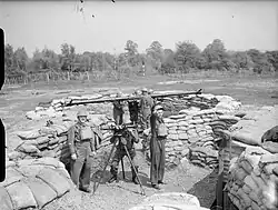 During the Phoney War period there were numerous changes of battery locations around south and south-east London, with RHQ moving to the Wickham Court Hotel, West Wickham, in September. There was a shortage of heavy AA (HAA) guns, and 302 AA Bty spent periods manning AA Light machine guns (AALMGs) at Tolworth and Kingston Vale (October 1939) and Cricklewood (April 1940) before returning to man HAA gunsites. One of the HAA sites taken over was at Hayes Common, equipped with 3-inch guns. In May 1940 an official photographer pictured 303 AA Battery manning guns at this site.[3][6]