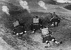 The 9th Royal Scots returned from their summer camp at Stobs on Sunday, 2 August 1914 and two days later they were embodied when Britain declared war on Germany.[9] They served with Lothian Brigade, part of Scottish Coast Defences (Infantry). Among their duties they built and manned the Section No.3 defences of Edinburgh, provided guards at Redford Prisoner of War camp and also provided the machine-gun section for an armoured train.[10]