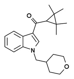 A-834,735 is a drug developed by Abbott Laboratories that acts as a potent cannabinoid receptor full agonist at both the CB1 and CB2 receptors, with a Ki of 12 nM at CB1 and 0.21 nM at CB2. Replacing the aromatic 3-benzoyl or 3-naphthoyl group found in most indole derived cannabinoids with the 3-tetramethylcyclopropylmethanone group of A-834,735 and related compounds imparts significant selectivity for CB2, with most compounds from this group found to be highly selective CB2 agonists with little affinity for CB1. However, low nanomolar CB1 binding affinity is retained with certain heterocyclic 1-position substituents such as (N-methylpiperidin-2-yl)methyl (cf. AM-1220, AM-1248), or the (tetrahydropyran-4-yl)methyl substituent of A-834,735, resulting in compounds that still show significant affinity and efficacy at both receptors despite being CB2 selective overall.[1][2][3][4][5]