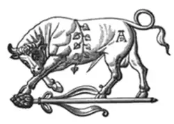 The A.D. Club's symbol is a bull on a sword. This symbol is carved in stone over the entrance to the society's clubhouse. It is also on the A.D. Club's china, manufactured by Wedgewood.[12] It is also used on early 19th-century club medals, along with the motto Aut Birat Aut Abeat that translates to "Either Drink or Leave".[13]