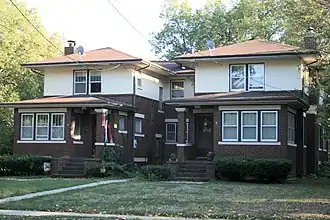 The A.J. Andrus Duplex, also known as the Paul Pritchard Duplex, is a historic building located in Mason City, Iowa, United States. The two story structure was completed in 1921 in the Prairie School style. Its most distinguishing feature is its C-shaped plan.[2] The exterior is composed of brick on the first floor and stucco on the second floor. The duplex has a horizontal emphasis about it with a broad, overhanging hipped roof, and bands of windows. It was listed on the National Register of Historic Places in 1980.[1]