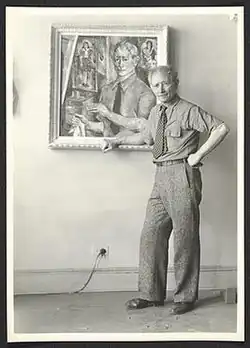 A. S. Baylinson with self-portrait painting, 194?. Unidentified photographer. A. S. Baylinson papers, Archives of American Art, Smithsonian Institution.