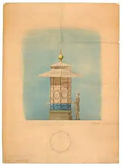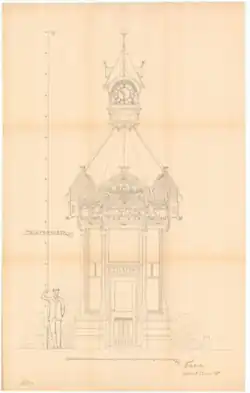Koch's original telephone kiosks are nine metres tall, hexagonal and with a floor area of approximately nine square metres. They are constructed in pine wood on a granite plinth. The copper roof is topped by a triangular flèche with clock faces on all sides.[4] Just below the roof are six teak tree reliefs, one on each side, featuring the 12 astrological sign. Above the reliefs is a frieze with symbolic representations of shipping (ships), industry (tools), (then) modern technology (telephoning gentlemen) and agriculture (animals and plants).