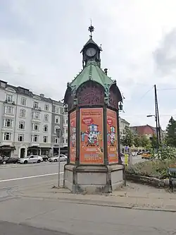 Jensen's telephone kiosks from 1913 are designed in the Neo-Baroque style. They are also hexagonal and topped by a copper roof but somewhat larger.