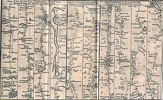 - ^ "A map of the Road from London to Harwich, Chelmsford to St. Edmonds Bury, Colchester to Great Yarmouth". Ancestry.com. 1766. Retrieved 30 November 2008.