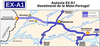 - ^ Paniagua Simón, Eladio (21 March 2015). "Inaugurado el tramo de cinco kilómetros de la EX-A1 que une Coria y Moraleja". Extremadura. Grupo Vocento.