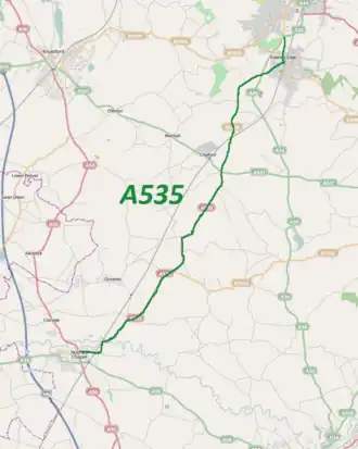 The A535 road is a non-primary route in England that runs from Holmes Chapel, Cheshire to Alderley Edge, Cheshire.[1] It passes through the Dane River valley. It is the main road that gives access to the Jodrell Bank Observatory and the Quinta Arboretum, planted by Sir Bernard Lovell in 1948.[2][3][4]