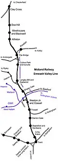 Finally, the road straddles the River Amber before meeting the A6 at Ambergate. At Bullbridge (Sawmills), there is an exit to the south for the logistics company Lockwood Group.[15] The road follows adjacent to the Midland Main Line. Coats Viyella Clothing had a main dyeing factory to the north. The road passes under the Midland Main Line at a low (15 ft 3 in [4.65 m]) bridge, after which National Grid plc have one of their Pipelines Maintenance Centres (PMC Ambergate) on the right.[16] A few metres before the A6 T-junction, it passes under the Derwent Valley line next to Ambergate railway station, and the Hurt Arms on the A6.
