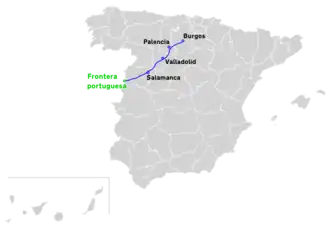 The Autovía A-62 (also known as Autovía de Castilla) is a Spanish autovía which starts in Burgos and runs through the community of Castile and León, via the cities of Palencia, Valladolid and Salamanca, before ending at the Portuguese border and the A25 autoestrada. It forms part of European route E80 and replaced the former N-620 road.[1]