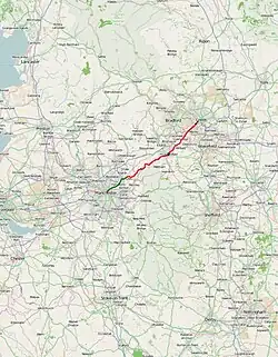 The A62 begins at a junction with the A58 road as Gelderd Road in Leeds. It runs through West Yorkshire, passing through Birstall, Heckmondwike, Liversedge, Huddersfield, Linthwaite, Slaithwaite, and Marsden. It crosses the Pennines at Standedge, and continues through Saddleworth and into Oldham. From there, the A62 runs into Manchester as Oldham Street and Oldham Road through Failsworth, ending at the Manchester Inner Ring Road.