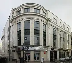 The former cinema is Art Deco in style,[22] albeit a freely interpreted version of it.[23] The East Street (north) and the Grand Junction Road (south) elevations are treated differently: the latter is "strongly vertical",[23] "opulent and streamlined",[5] while that facing East Street is curved, with long fasces-style pilaster-like features and elements of Classical[23] and, in the capitals, Egyptian architecture.[5] All sides of the building are clad in white faience tiles[23] by Shaw's Glazed Brick Company of nearby Lewes,[5] which earned the cinema the nickname of "the white whale", and more than one million locally produced white bricks make up the walls.[24][25] Although much larger than the surrounding buildings, especially on the small-scale East Street, it "provide[s] an interesting transition to the seafront".[24][25] Despite the internal alterations, it is also significant for being the last of Brighton's super-cinemas to survive: the Regent and the Astoria have been demolished.[5]