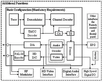 The Brazilian technical standard for digital television concerns specifications of receivers for digital broadcasting, and specifies, in particular, minimum basic functions and essential requirements to satisfy initial needs for the deployment of digital terrestrial television broadcasting. The standard does not cover features which affect the quality of the displayed picture or application rather than whether receiver is able to decode pictures at all. Such issues are left to the marketplace.