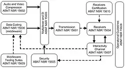 The data coding aspects of the Brazilian Digital Terrestrial Television Standards are described in the following documents published by ABNT, the Brazilian Association of Technical Standards (Associação Brasileira de Normas Técnicas):[1] ABNT NBR 15606-1:2007 - Digital terrestrial television - Data coding and transmission specification - Part 1: Data coding; ABNT NBR 15606-2:2007 - Digital terrestrial television - Data coding and transmission specification - Part 2: Ginga-NCL for fixed and mobile receivers: XML application language for application coding; ABNT NBR 15606-3:2007- Digital terrestrial television - Data coding and transmission specification - Part 3: Data transmission specifications for digital broadcasting; and ABNT NBR 15606-5:2008 - Digital terrestrial television - Data coding and transmission specification – Part 5: Ginga[2]-NCL[3] for portable receivers: XML application language for application coding.