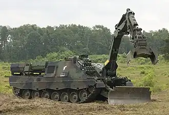 Located centrally between the crew compartment at the front of the vehicle is the excavator arm. When not in use this is traversed to the rear and locates between the crew compartment. The excavator arm broadly resembles that of a conventional backhoe loader, but with two pivot points instead of one. The standard excavator bucket has a volume of one cubic meter and, when in continuous use, can move up to 200 cubic meters of earth per hour. The arm has a maximum horizontal reach of 9 meters and a reach of 8.2 meters vertically. The bucket and other tools can be removed/attached from under armour via a quick-coupling device. A range of other tools are available and these include a gripper, a hydraulic hammer, an earth auger, or a fascine launching system.[1] On a rack above the rear engine deck two of these tools may be transported if required. The excavator arm may also be used for lifting items such as logs or fascines, and has a maximum lift capacity of 3.5-tonnes; 2.6-tonnes with the bucket attached.[1][2]