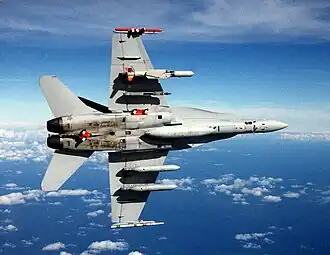 ![]() An F/A-18 Hornet carrying one SLAM-ER missile (top) and two AN/AWW-13 datalink pods (bottom) | |