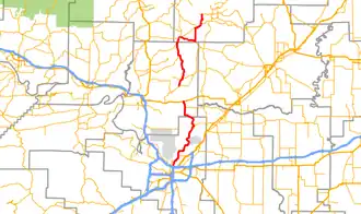 Highway 107 begins at I-30 and I-40 in North Little Rock as a continuation of Main Street and runs through some suburbs until entering Faulkner County. The route runs north to terminate at U.S. Route 64B (US 64B) in Vilonia. Highway 107 has 16.4 miles (26.4 km) in Pulaski County and 6.4 miles (10.3 km) in Faulkner County.[2][3]
