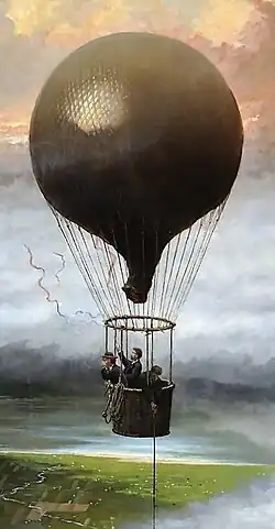 The painting depicts a gas balloon flying at a high altitude with three passengers visible in the basket or gondola. Through the fog, land and water can be seen far below. Pink clouds are visible, indicating that the sun has recently set.[1] The painting only depicts three passengers, even though the actual trip it is based on involved four. The figure in the back of the gondola is seen with his right hand held up and colorful streamers aloft fluttering above and to the left, as if measuring the wind to determine their direction and speed. The figure on the left in front appears to be looking through opera glasses and observing their current course and view. These glasses were distributed to the passengers just prior to the flight. The third person is leaning over the gondola and handling a rope, perhaps a drag rope or ballast tied to a rope, or maybe even a bit of artistic license. The painting is signed "Jules Tavernier San Francisco 1875" in the lower left-hand corner of the canvas.