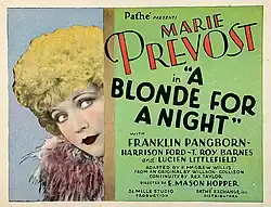 A Blonde for a Night is a 1928 American silent comedy film directed by E. Mason Hopper and F. McGrew Willis and starring Marie Prevost, Franklin Pangborn and Harrison Ford.[1][2]