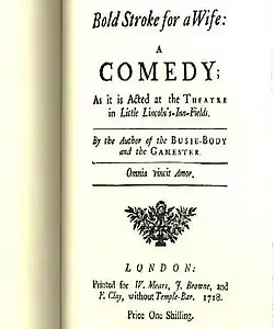 A Bold Stroke for a Wife is Susanna Centlivre's 18th-century satirical English play first performed in 1718. The plot expresses the author's unabashed support of the British Whig Party: she criticises the Tories, religious hypocrisy, and the greed of capitalism.