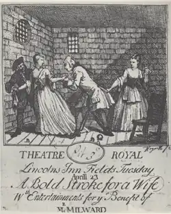 During its long life the play became very popular in the United States. It was produced as early as 1782 (in Baltimore). In 1786 a Charleston, South Carolina, journalist commented that "The Bold Stroke for a Wife . . . is one of the few comedies that has stood the test of time -- it is full of business and intrigue and abounds with such a variety as always arrests and keeps up the attention of the audience until it ends."[2] The play continued to find American audiences into the nineteenth century, and was billed as a "fine old comedy" when it was presented at Wallack's Theatre on Broadway in 1863.