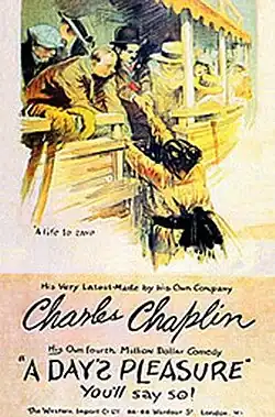 A Day's Pleasure (1919) is Charlie Chaplin's fourth film for First National Films. It was created at the Chaplin Studio. It was a quickly made two-reeler to help fill a gap while working on his first feature The Kid. It is about a day outing with his wife and the kids and things do not go smoothly. Edna Purviance plays Chaplin's wife and Jackie Coogan one of the kids. The first scene shows the Chaplin Studio corner office in the background while Chaplin tries to get his car started.