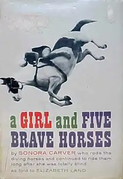 At the age of 20, Sonora Webster Carver joined William Frank Carver's Wild West Show which featured diving horses and performed at Atlantic City's Steel Pier. Although Carver was blinded in a diving accident seven years later, she continued to dive afterward.[1] She wrote "A Girl and Five Brave Horses" documenting her life and her memories of diving horses.[1]