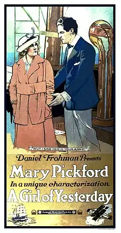 A Girl of Yesterday is a 1915 American silent comedy film directed by Allan Dwan, and distributed by Paramount Pictures and Famous Players–Lasky. The film starred Mary Pickford (who also wrote the scenario) as an older woman. Before this film, Pickford was mainly cast in "little girl" roles which were popular with the public.[2] A Girl of Yesterday costarred Pickford's younger brother Jack, Marshall Neilan, Donald Crisp and Frances Marion, who later became a prolific screenwriter. Real life aviation pioneer Glenn L. Martin also made a cameo in the film.[3]