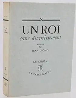 Published by Éditions de la Table ronde in June 1947, Un roi sans divertissement broke the embargo imposed by the Conseil national des écrivains, becoming Giono's first post-war work. It was subsequently republished by Éditions Gallimard in December of the same year.[4] Giono later categorized this novel, along with several others from the post-war period, as "chroniques romanesques" or "romantic chronicles."[5]