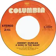 "A Song in the Night" is a country music song written by Bobby Lee Springfield, recorded by Johnny Duncan. It was the first of two singles from his 1977 LP, Come a Little Bit Closer. Harmony vocals during the last minute of the song were provided by Janie Fricke.