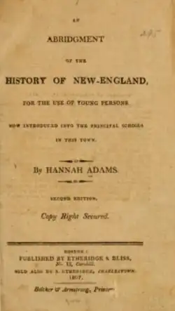 Adams published in 1805 An abridgement of the history of New-England, for the use of young persons (B. & J. Homans, and John West. A. Newell, printer; Boston). The later work retained the most important parts of the Summary History. In twenty chapters, she comprised the substance of her first book. Long accounts of polemic divinity, which might not be read by the young, nor understood by the old, were omitted, and greatly abbreviated the story of the American Revolutionary War. She improved her work by means of later writers, and particularly by John Marshall's life of George Washington. The paragraphs were numbered, and the form and size of the book were well-suited to the use of children. It was said by Munroe & Francis (1895) that Adams possessed uncommon acuteness in discovering the repositories of knowledge adapted to her purpose, and a facility in using it.[1]