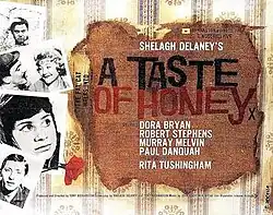 A Taste of Honey is a 1961 British New Wave drama film directed by Tony Richardson and starring Rita Tushingham, Dora Bryan, Robert Stephens and Murray Melvin.[6] It is an adaptation of the 1958 play of the same name by Shelagh Delaney. Delaney wrote the screenplay with Richardson, who had directed the original Broadway production of the play in 1960. As with the play, the film is an exemplar of a social realist genre of British media known as kitchen sink realism.