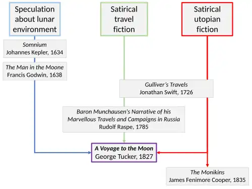 In terms of antecedents, J. L. Hilton, in a 2005 article in Akroterion, identifies the novel as belonging to several literary traditions that were already well-established at the time.[32] One of these is the speculation about conditions on the Moon that had earlier appeared in works like Johannes Kepler's posthumously published 1634 novel Somnium and Francis Godwin's posthumously published 1638 novel The Man in the Moone;[32] J. O. Bailey writes about the lunar voyage tradition that Tucker "add[ed] to the established patterns several features of importance" including the use of anti-gravity and the notion that space is a cold and airless void.[3] Another is the satirical tradition of works like Swift's Gulliver's Travels and the various stories about Baron von Münchhausen.[32] Many others have also compared the book to Gulliver's Travels; for instance, James Fieser describes A Voyage to the Moon as "modeled after Swift's Gulliver's Travels" and Joel Nydahl writes in the 1980 book America as Utopia that it is "obviously derivative" of Swift's work.[2][5][11][33] Nydahl further comments that A Voyage to the Moon comes the closest of all the American works of satirical utopian fiction to matching the quality of Gulliver's Travels—James Fenimore Cooper's 1835 novel The Monikins being the only possible contender.[11] I. F. Clarke views Tucker's Lunarium as akin to the lodestone that keeps Swift's flying island of Laputa airborne, while Vesselin M. Budakov in the 2020 book Swiftian Inspirations more modestly considers it a "slight allusion".[34][35] Bailey finds Tucker's Glonglims reminiscent of Swift's Laputan scientists.[3]