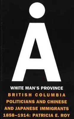 A White Man's Province: British Columbia Politicians and Chinese and Japanese Immigrants, 1858-1914 is a 1989 book by Patricia E. Roy, published by the University of British Columbia Press. It discusses late 19th and early 20th century anti-Asian sentiment within British Columbia.[1] Politicians from British Columbia referred to the place as "a white man's province", and the book includes an analysis of the phrase itself.[2] As of 1992 Roy was planning to create a sequel.[3]