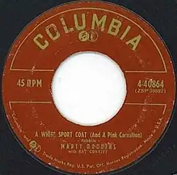 "A White Sport Coat (And A Pink Carnation)" is a 1957 country and western song with words and music both written by Marty Robbins. It was recorded at the Bradley Studios in Nashville, Tennessee on January 25, 1957, and released on the Columbia Records label on March 4.[2] The arranger and recording session conductor was Ray Conniff, an in-house conductor/arranger at Columbia. Robbins had demanded to have Conniff oversee the recording after his earlier hit, "Singing the Blues", had been quickly eclipsed on the charts by Guy Mitchell's cover version, which was scored and conducted by Conniff in October 1956.