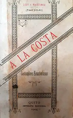 A la costa is a 1904 novel by Ecuadorian politician and writer Luis A. Martínez.[1] It is one of the leading Ecuadorian works on social and political commentary, and an insight into the history at the time.[2] The novel covers a series of issues, including political conflict between liberals and conservatives and social identity, economic differences between the mountainous regions and the coast and between plantation workers and urbanites, and prostitution. It reflects on the overall meaning of life.[3]