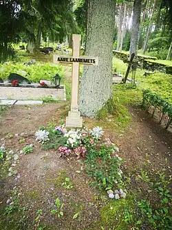Aare Laanemets was married and divorced. He had two children. Prior to his death he was in a relationship with actress and singer Heli Vahing.[10][11] On 28 October 2000, he died after suffering a stroke in Tallinn, aged 46.[12] He was interred at the cemetery in the village of Kullamaa in Lääne County.[10][11]