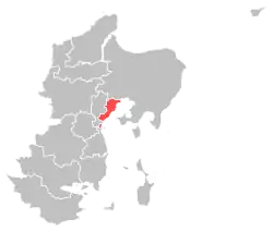 The Danish government places the district's center at 56°15′54″N 10°18′11″E / 56.265°N 10.303°E.[9]