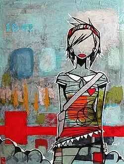 Kraten is a mixed media artist, using found objects such as refrigerator doors and discarded windows to dismantled doghouses and old street signs as well as using nontraditional paint media such as correction fluid. He prefers to use his hands to work directly with the paint, giving a textured quality to the work; it is intriguing to note that brushes are never used in any of his pieces. Aaron is a self-taught artist.