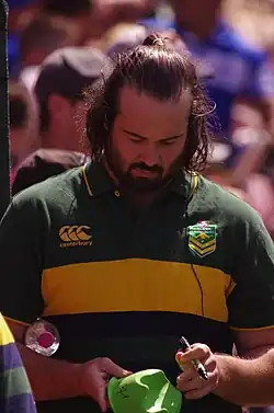 Making 19 appearances for Wests Tigers, he was the club's leader in hit ups, and had a club-high average of 160 metres per game in attack.[42] At year's end, he was chosen in the Australian squad for the Four Nations, but was absent from the test against New Zealand due to his wedding. Coach Mal Meninga said, "The timing is not perfect but family comes first and you've got to keep the wives happy don't you?"[43] He was the starting prop in all four Four Nations matches, which were all victories.
