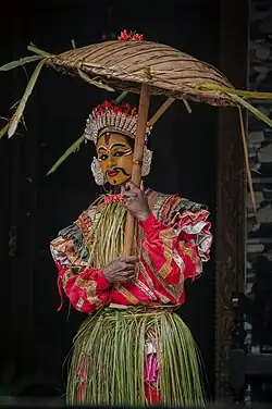 The costume differs by region, In Sullia, Aati Kalenja dancer wears a face mask which is made from the spathe of an areca nut branch. [4]