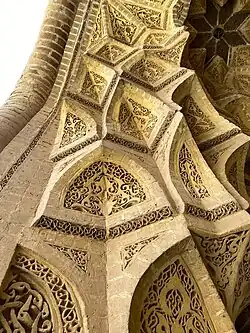The bricked arches and iwans of the palace include vaulted recesses and are filled with carved geometric decorations.[14] Specifically the eastern corridor contains a vault that consists of a series of interlocked muqarnas that appear like a corbelled cell. The muqarnas appear through the iwans and end each in an eight-pointed star. Although vaulted muqarnas have already become a widespread feature of Islamic architecture by the 13th century, the muqarnas in the palace feature unique inscriptions and ornaments.[15]