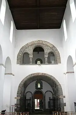 From the outset, the church had a western tower (since heavily rebuilt), a nave and two aisles five bays long, a transept and a chancel with an apse. It retains much of its original plan, with the exception of the chancel which was replaced by the current three-sided Gothic structure with lancet windows in the 13th century.[1] Originally, the ground floor of the tower, open to the nave, also contained a chancel which could be used for celebrating mass; an unusual feature particular for churches influenced by the architecture of the former Saint Lambert's Cathedral in Liège, which had a "counter-chancel" in its west end. A peculiarity is also the tribune on the first floor of the tower, open to the nave through three arches. During the Middle Ages an altar dedicated to Saint Michael was displayed here. Overall, the church displays strict geometrical volumes.[2]