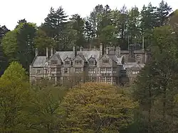 At the same time that Abbeystead House was being built, Douglas and Fordham designed two lodges for the estate.[9] Lancaster Lodge stands at the head of the drive leading to the house. This has an L-shaped plan and is "quietly Elizabethan" in style.[2] It is a Grade II listed building.[10] York Lodge stands 0.5 miles (1 km) to the east on the road to Dunsop Bridge[2] and is also listed Grade II.[11] In 1891–92 the same architects designed stables and an adjoining pair of cottages for the house.[12]