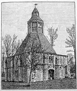 The building is supported by curved buttresses on each side leading up to a cornice with grotesque gargoyles.[2] Inside are four large arched fireplaces with smoke outlets above them, with another outlet in the centre of the pyramidal roof.[3] The building is designed so that hot air from the cooking fires would have risen up to the top of the building and escaped, whilst cooler air came from openings lower down and sunk into the kitchen, cooling it.[7][8]