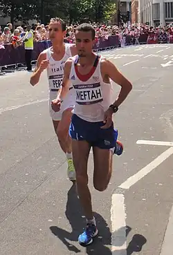 He ran for Morocco at the Pan Arab Games and won a gold medal in the half marathon for his home nation.[1] Transferring his nationality, Meftah represented France at the 2010 IAAF World Cross Country Championships and finished in 40th place. He broke the French record in the half marathon at the Semi-Marathon de Lille in September that year, running a time of 1:00:46 to erase Larbi Zeroual's mark from 1999.[2] At the 2010 European Cross Country Championships he led the French men to the team title, although he just missed out on an individual medal with his fourth-place finish.[3] Meftah moved up a further distance on the roads, making his debut at the 2011 Paris Marathon in April.[4] He was Europe's top finisher at the competition, coming tenth, and completed the course in a time of 2:10:53 hours.[5]