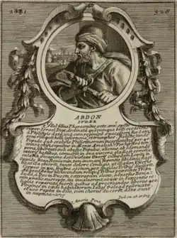 Abdon (Hebrew: עַבְדּוֹן ‘Aḇdōn, "servile" or "service") was the son of Hillel, a Pirathonite, and was the eleventh Judge of Israel mentioned in the Book of Judges (Judges 12:13–15). He was a member of the tribe of Ephraim, and in the biblical account was credited with having forty sons and thirty grandsons. He restored order in the central area of Israel "after the disastrous feud with Jephtha and the Gileadites".[1] He judged Israel for eight years. He was buried on Ephraimite land, in Pirathon, in the hill-country of the Amalekites.