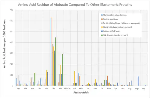 The amino acid composition of protein within the inner hinge ligament of bivalve mollusks was first discovered by Robert E. Kelly and Robert V. Rice in 1967, who subsequently proposed the protein’s name as abductin.[3] This was derived from its function as the abductor of the shells of bivalve mollusks. Kelly and Rice discovered that the protein lacked the presence of hydroxyproline and hydroxylysine, which are amino acids indicative of the common protein, collagen. Further analysis showed that abductin is made of three prominent amino acids: glycine, methionine, and phenylalanine, which are arranged in multiple repeating sequences throughout the molecule.[4] This was found in Placopecten magellanicus. Abductin is similar to elastin and resilin, but has a main difference having high concentrations of glycine and methionine.[3] The glycine and methionine, and other amino acid residues, vary in concentration with different species. In Argopecten irradians, for example, glycine and methionine make up 57.3% and 14.3% of the protein, respectively.[4] The high concentration of methionine found in abductin makes it unique because it is not a common occurrence in natural elastomeric proteins.