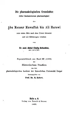 - ^ Achundow, Abdul-Chalig (1893). Die pharmakologischen Grundsätze (Liber fundamentorum pharmacologiae) des Abu Mansur Muwaffak bin Ali Harawi. Historische Studien aus dem Pharmakologischen Institute der Kaiserl. Universität Dorpat (in German). Vol. 3. Halle a. S.: Verlag von Tausch & Grosse.