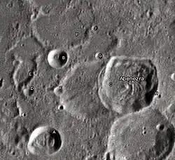 By convention these features are identified on lunar maps by placing the letter on the side of the crater midpoint that is closest to Abenezra.